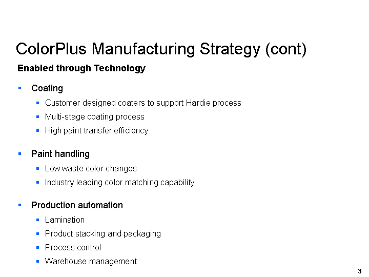 | ColorPlus Manufacturing Strategy (cont) Enabled through Technology Coating Customer designed coaters to support Hardie process Multi-stage coating process High paint transfer efficiency Paint handling Low waste color changes Industry leading color matching capability Production automation Lamination Product stacking and packaging Process control Warehouse management |