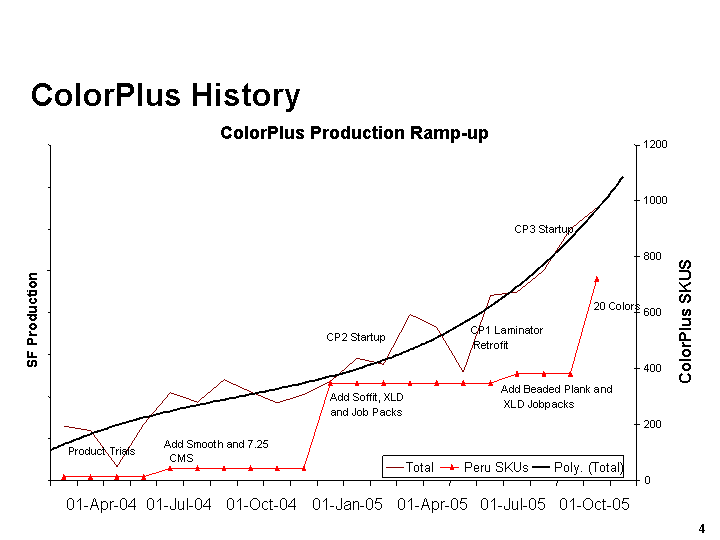 | ColorPlus History ColorPlus Production Ramp-up 01-Apr-04 01-Jul-04 01-Oct-04 01-Jan-05 01-Apr-05 01-Jul-05 01-Oct-05 SF Production 0 200 400 600 800 1000 1200 ColorPlus SKUS Total Peru SKUs Poly. (Total) Product Trials CP1 Laminator Retrofit Add Smooth and 7.25 CMS Add Beaded Plank and XLD Jobpacks Add Soffit, XLD and Job Packs CP2 Startup CP3 Startup 20 Colors |
