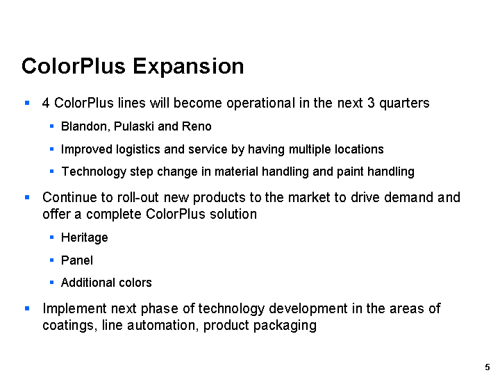 | ColorPlus Expansion 4 ColorPlus lines will become operational in the next 3 quarters Blandon, Pulaski and Reno Improved logistics and service by having multiple locations Technology step change in material handling and paint handling Continue to roll-out new products to the market to drive demand and offer a complete ColorPlus solution Heritage Panel Additional colors Implement next phase of technology development in the areas of coatings, line automation, product packaging |