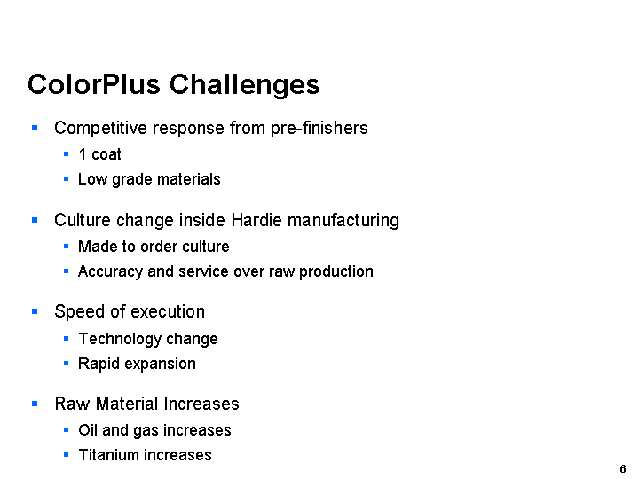| ColorPlus Challenges Competitive response from pre-finishers 1 coat Low grade materials Culture change inside Hardie manufacturing Made to order culture Accuracy and service over raw production Speed of execution Technology change Rapid expansion Raw Material Increases Oil and gas increases Titanium increases |
