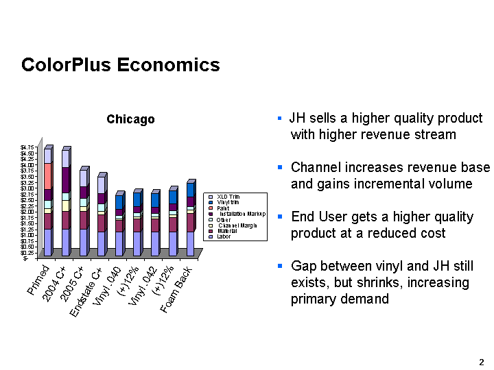 | ColorPlus Economics JH sells a higher quality product with higher revenue stream Channel increases revenue base and gains incremental volume End User gets a higher quality product at a reduced cost Gap between vinyl and JH still exists, but shrinks, increasing primary demand XLD Trim Vinyl trim Paint Installation Markup Other Channel Margin Material Labor |