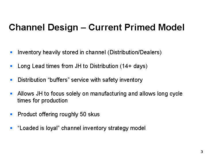 | Channel Design - Current Primed Model Inventory heavily stored in channel (Distribution/Dealers) Long Lead times from JH to Distribution (14+ days) Distribution "buffers" service with safety inventory Allows JH to focus solely on manufacturing and allows long cycle times for production Product offering roughly 50 skus "Loaded is loyal" channel inventory strategy model |