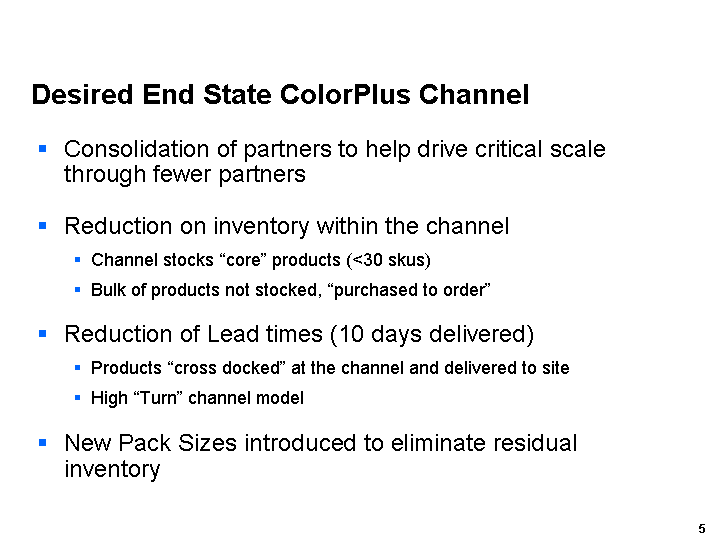 | Desired End State ColorPlus Channel Consolidation of partners to help drive critical scale through fewer partners Reduction on inventory within the channel Channel stocks "core" products (<30 skus) Bulk of products not stocked, "purchased to order" Reduction of Lead times (10 days delivered) Products "cross docked" at the channel and delivered to site High "Turn" channel model New Pack Sizes introduced to eliminate residual inventory |