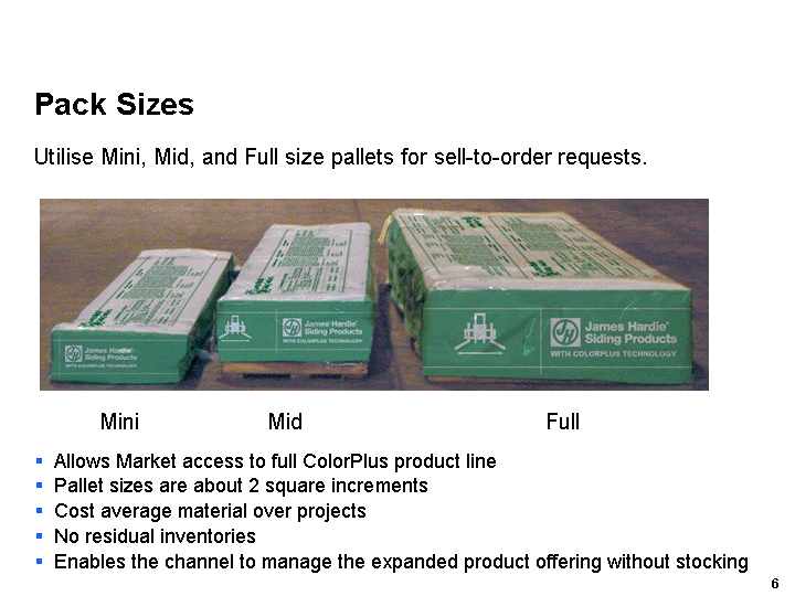 | Pack Sizes Allows Market access to full ColorPlus product line Pallet sizes are about 2 square increments Cost average material over projects No residual inventories Enables the channel to manage the expanded product offering without stocking Utilise Mini, Mid, and Full size pallets for sell-to-order requests. Mini Mid Full |