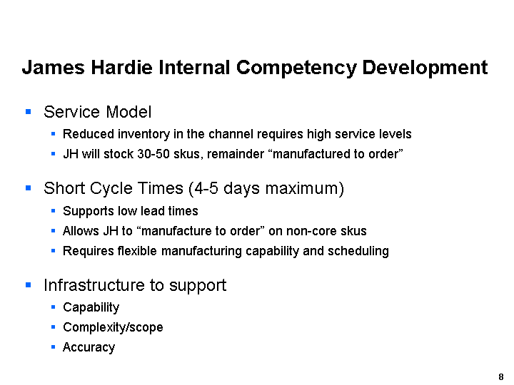 | James Hardie Internal Competency Development Service Model Reduced inventory in the channel requires high service levels JH will stock 30-50 skus, remainder "manufactured to order" Short Cycle Times (4-5 days maximum) Supports low lead times Allows JH to "manufacture to order" on non-core skus Requires flexible manufacturing capability and scheduling Infrastructure to support Capability Complexity/scope Accuracy |