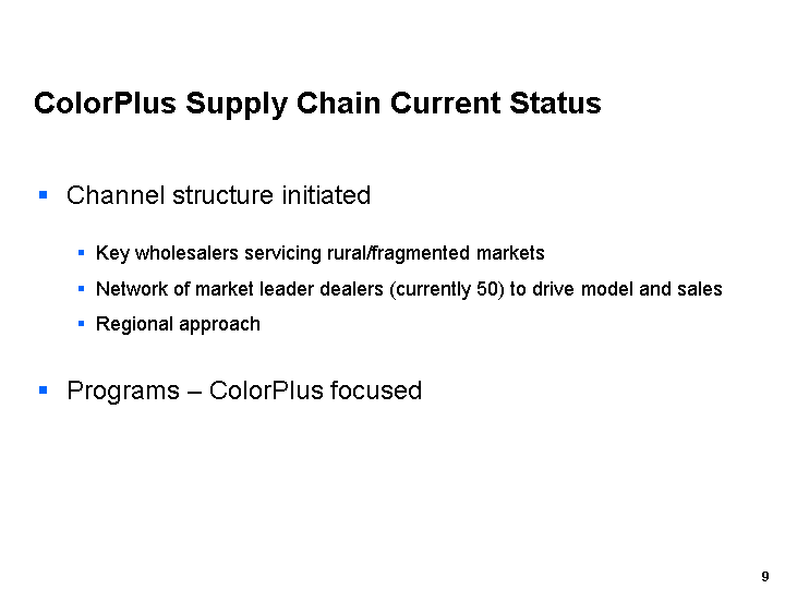 | ColorPlus Supply Chain Current Status Channel structure initiated Key wholesalers servicing rural/fragmented markets Network of market leader dealers (currently 50) to drive model and sales Regional approach Programs - ColorPlus focused |