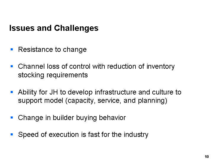 | Issues and Challenges Resistance to change Channel loss of control with reduction of inventory stocking requirements Ability for JH to develop infrastructure and culture to support model (capacity, service, and planning) Change in builder buying behavior Speed of execution is fast for the industry |
