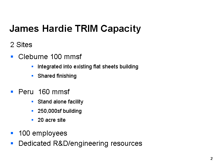 | James Hardie TRIM Capacity 2 Sites Cleburne 100 mmsf Integrated into existing flat sheets building Shared finishing Peru 160 mmsf Stand alone facility 250,000sf building 20 acre site 100 employees Dedicated R&D/engineering resources |