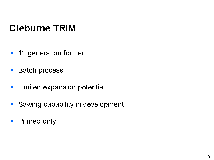 | Cleburne TRIM 1st generation former Batch process Limited expansion potential Sawing capability in development Primed only |