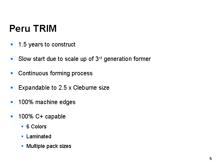 | Peru TRIM 1.5 years to construct Slow start due to scale up of 3rd generation former Continuous forming process Expandable to 2.5 x Cleburne size 100% machine edges 100% C+ capable 6 Colors Laminated Multiple pack sizes |