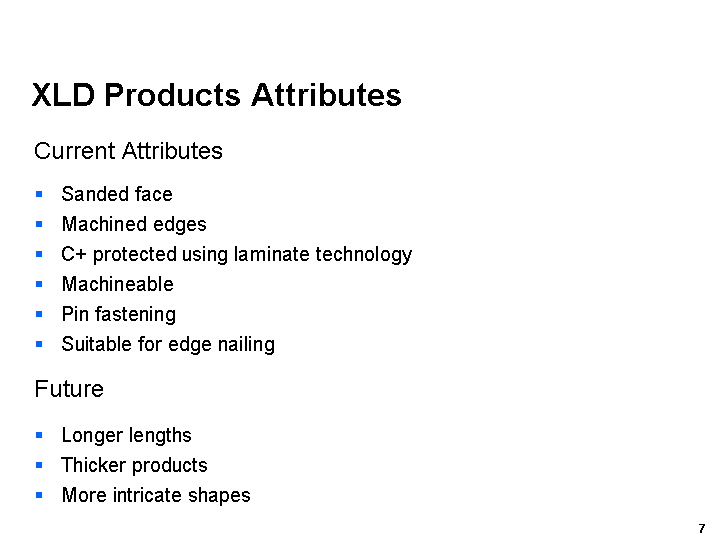 | XLD Products Attributes Current Attributes Sanded face Machined edges C+ protected using laminate technology Machineable Pin fastening Suitable for edge nailing Future Longer lengths Thicker products More intricate shapes |