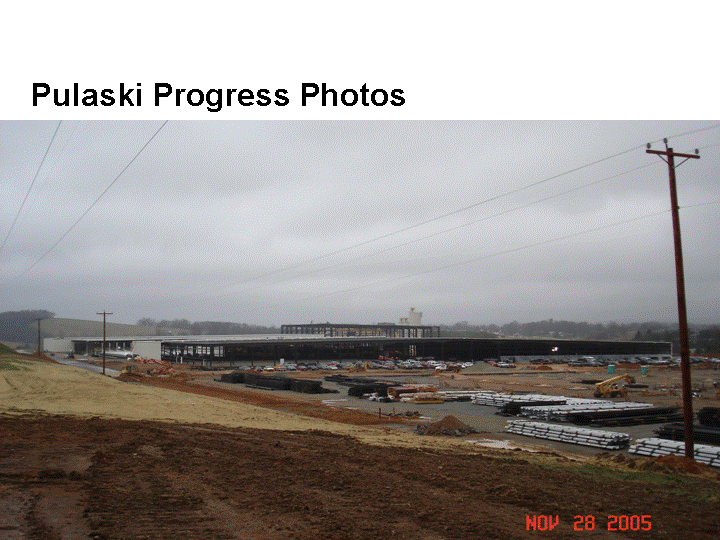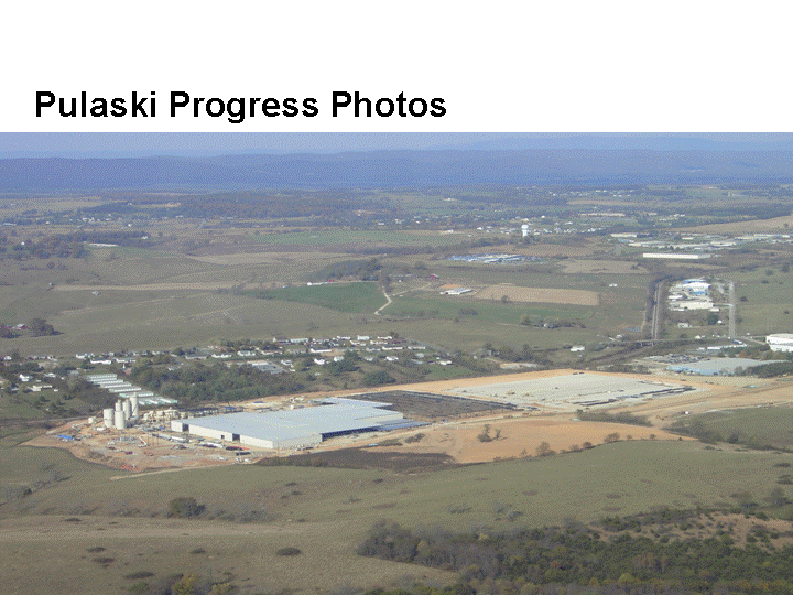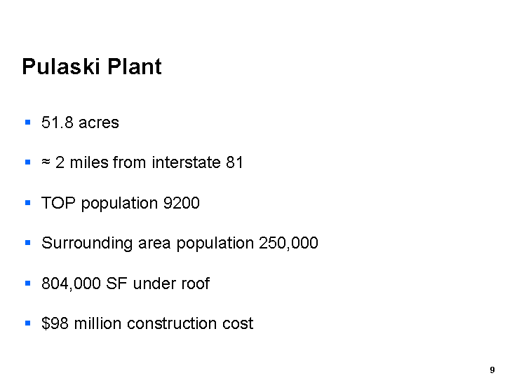 | Pulaski Plant 51.8 acres ^ 2 miles from interstate 81 TOP population 9200 Surrounding area population 250,000 804,000 SF under roof $98 million construction cost |
