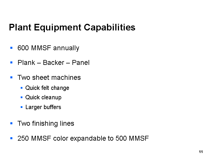 | Plant Equipment Capabilities 600 MMSF annually Plank - Backer - Panel Two sheet machines Quick felt change Quick cleanup Larger buffers Two finishing lines 250 MMSF color expandable to 500 MMSF |