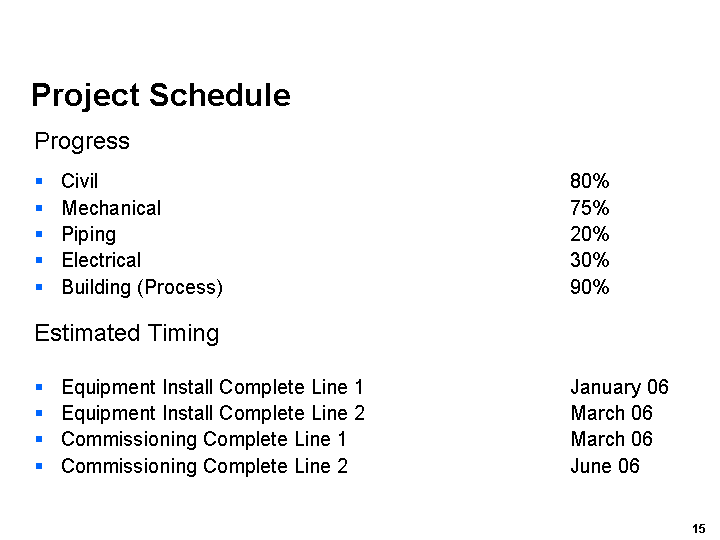 | Project Schedule Progress Civil 80% Mechanical 75% Piping 20% Electrical 30% Building (Process) 90% Estimated Timing Equipment Install Complete Line 1 January 06 Equipment Install Complete Line 2 March 06 Commissioning Complete Line 1 March 06 Commissioning Complete Line 2 June 06 |
