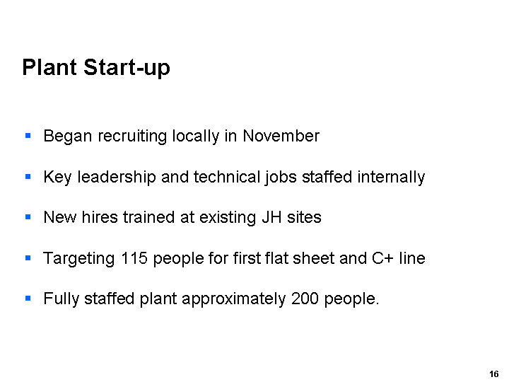 | Plant Start-up Began recruiting locally in November Key leadership and technical jobs staffed internally New hires trained at existing JH sites Targeting 115 people for first flat sheet and C+ line Fully staffed plant approximately 200 people. |