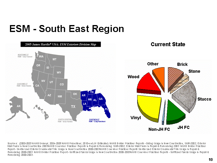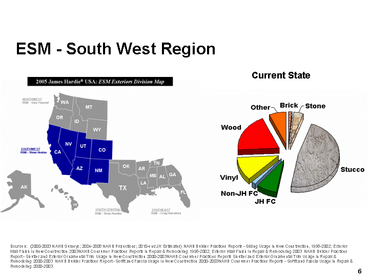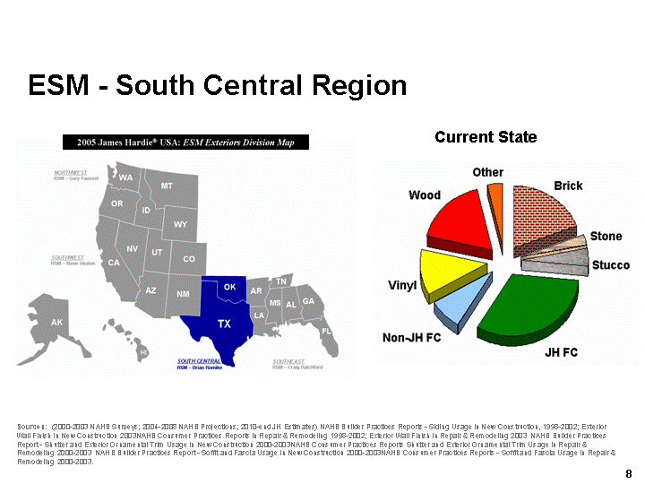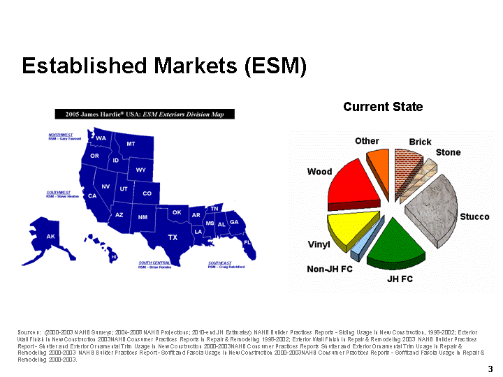 | Established Markets (ESM) Sources: (2000-2003 NAHB Surveys; 2004-2008 NAHB Projections; 2010-end JH Estimates) NAHB Builder Practices Reports - Siding Usage in New Construction, 1998-2002; Exterior Wall Finish in New Construction 2003NAHB Consumer Practices Reports in Repair & Remodeling 1998-2002; Exterior Wall Finish in Repair & Remodeling 2003 NAHB Builder Practices Report - Shutter and Exterior Ornamental Trim Usage in New Construction 2000-2003NAHB Consumer Practices Reports Shutter and Exterior Ornamental Trim Usage in Repair & Remodeling 2000-2003 NAHB Builder Practices Report - Soffit and Fascia Usage in New Construction 2000-2003NAHB Consumer Practices Reports - Soffit and Fascia Usage in Repair & Remodeling 2000-2003. Current State |