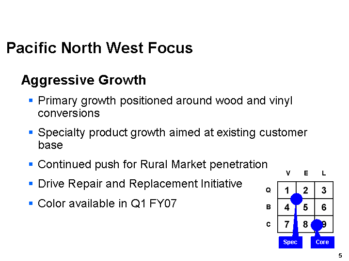 | Aggressive Growth Primary growth positioned around wood and vinyl conversions Specialty product growth aimed at existing customer base Continued push for Rural Market penetration Drive Repair and Replacement Initiative Color available in Q1 FY07 Pacific North West Focus V E L Q B C Core Spec |