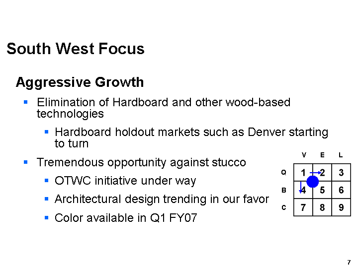 | Aggressive Growth Elimination of Hardboard and other wood-based technologies Hardboard holdout markets such as Denver starting to turn Tremendous opportunity against stucco OTWC initiative under way Architectural design trending in our favor Color available in Q1 FY07 South West Focus V E L Q B C |
