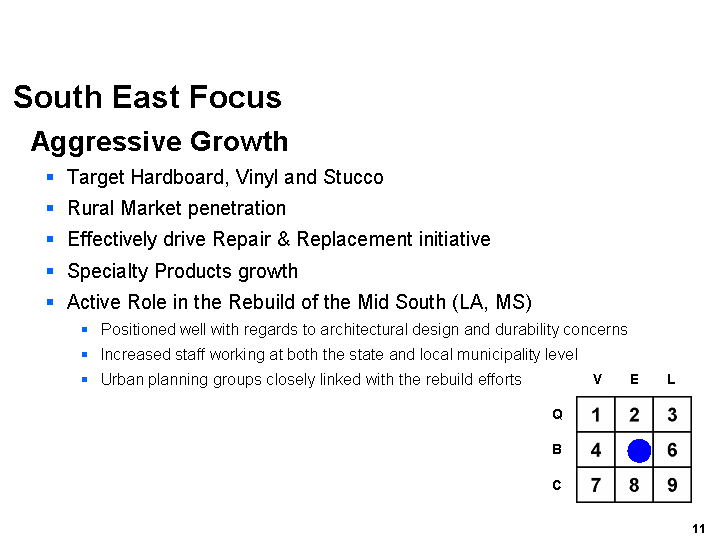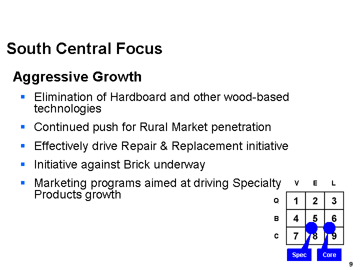 | Aggressive Growth Elimination of Hardboard and other wood-based technologies Continued push for Rural Market penetration Effectively drive Repair & Replacement initiative Initiative against Brick underway Marketing programs aimed at driving Specialty Products growth South Central Focus V E L Q B C Core Spec |