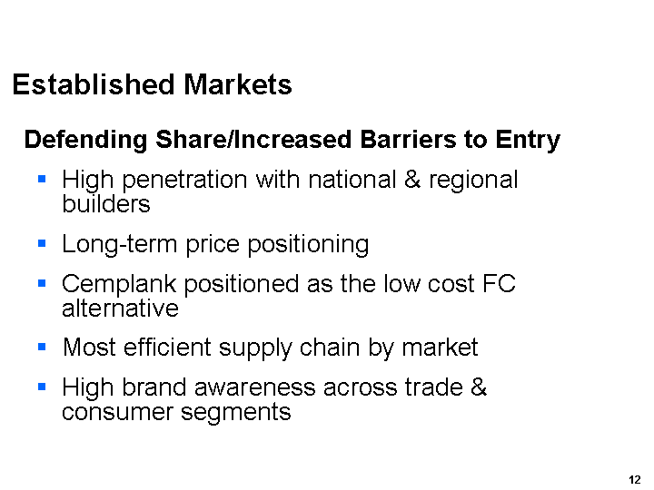 | Defending Share/Increased Barriers to Entry High penetration with national & regional builders Long-term price positioning Cemplank positioned as the low cost FC alternative Most efficient supply chain by market High brand awareness across trade & consumer segments Established Markets |