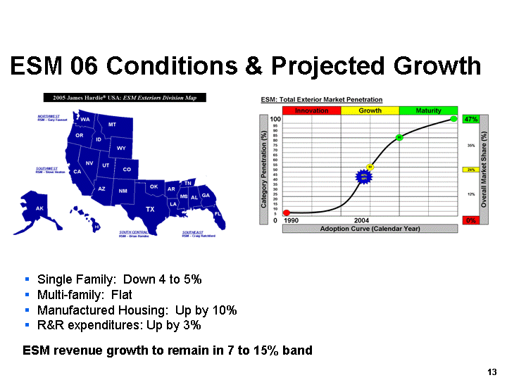 | Single Family: Down 4 to 5% Multi-family: Flat Manufactured Housing: Up by 10% R&R expenditures: Up by 3% ESM revenue growth to remain in 7 to 15% band ESM 06 Conditions & Projected Growth |