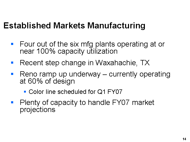 | Four out of the six mfg plants operating at or near 100% capacity utilization Recent step change in Waxahachie, TX Reno ramp up underway - currently operating at 60% of design Color line scheduled for Q1 FY07 Plenty of capacity to handle FY07 market projections Established Markets Manufacturing |