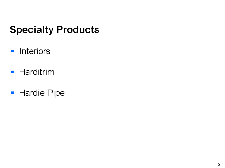 | Disclaimer This Management's Presentation contains forward-looking statements. We may from time to time make forward-looking statements in our periodic reports filed with or furnished to the United States Securities and Exchange Commission on Forms 20-F and 6-K, in our annual reports to shareholders, in offering circulars and prospectuses, in media releases and other written materials and in oral statements made by our officers, directors or employees to analysts, institutional investors, representatives of the media and others. Examples of forward-looking statements include: projections of our operating results or financial condition; statements regarding our plans, objectives or goals, including those relating to competition, acquisitions, dispositions and our products; statements about our future performance; statements about product or environmental liabilities; and expectations about payments to a special purpose fund for the compensation of proven asbestos-related personal injury and death claims. Words such as "believe," "anticipate," "plan," "expect," "intend," "target," "estimate," "project," "predict," "forecast," "guideline," "should," "aim" and similar expressions are intended to identify forward-looking statements but are not the exclusive means of identifying such statements. Forward-looking statements involve inherent risks and uncertainties. We caution you that a number of important factors could cause actual results to differ materially from the plans, objectives, expectations, estimates and intentions expressed in such forward-looking statements. These factors, some of which are discussed under "Risk Factors" beginning on page 6 of our Form 20-F filed on 7 July 2005 with the Securities and Exchange Commission, include but are not limited to: all matters relating to or arising out of the prior manufacture of products that contained asbestos by current and former James Hardie Australian subsidiaries; compliance with and changes in tax laws and treatments; competition and product pricing in the markets in which we operate; the consequences of product failures or defects; exposure to environmental, asbestos or other legal proceedings; general economic and market conditions; the supply and cost of raw materials; the success of our research and development efforts; our reliance on a small number of product distributors; compliance with and changes in environmental and health and safety laws; risks of conducting business internationally; compliance with and changes in laws and regulations; foreign exchange risks; the successful implementation of new software systems; and the successful transition of our new senior management. We caution you that the foregoing list of factors is not exclusive and that other risks and uncertainties may cause actual results to differ materially from those in forward-looking statements. Forward-looking statements speak only as of the date they are made. |