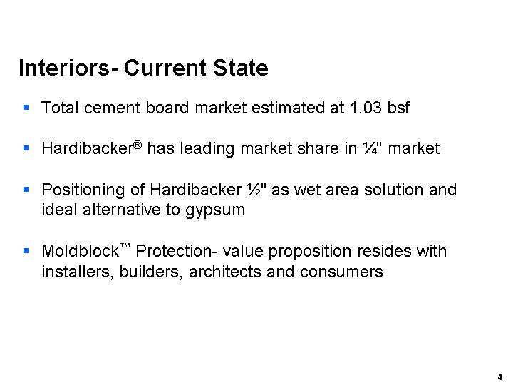 | Interiors- Current State Total cement board market estimated at 1.03 bsf Hardibacker(r) has leading market share in 1/4" market Positioning of Hardibacker 1/2" as wet area solution and ideal alternative to gypsum Moldblock(tm) Protection- value proposition resides with installers, builders, architects and consumers |
