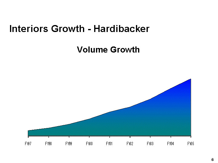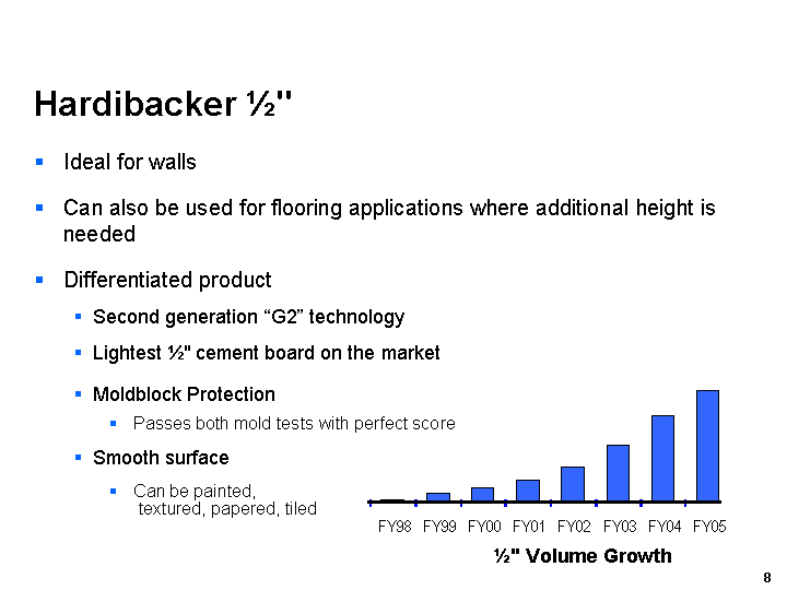 | Hardibacker 1/2" Ideal for walls Can also be used for flooring applications where additional height is needed Differentiated product Second generation "G2" technology Lightest 1/2" cement board on the market Moldblock Protection Passes both mold tests with perfect score Smooth surface Can be painted, textured, papered, tiled 1/2" Volume Growth FY98 FY99 FY00 FY01 FY02 FY03 FY04 FY05 |