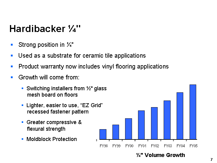 | Hardibacker 1/4" Strong position in 1/4" Used as a substrate for ceramic tile applications Product warranty now includes vinyl flooring applications Growth will come from: Switching installers from 1/2" glass mesh board on floors Lighter, easier to use, "EZ Grid" recessed fastener pattern Greater compressive & flexural strength Moldblock Protection 1/4" Volume Growth FY98 FY99 FY00 FY01 FY02 FY03 FY04 FY05 |