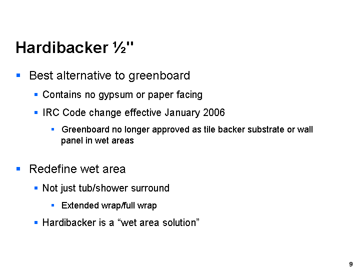 | Hardibacker 1/2" Best alternative to greenboard Contains no gypsum or paper facing IRC Code change effective January 2006 Greenboard no longer approved as tile backer substrate or wall panel in wet areas Redefine wet area Not just tub/shower surround Extended wrap/full wrap Hardibacker is a "wet area solution" |