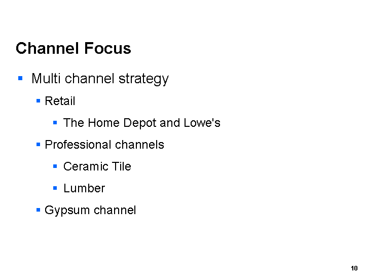 | Channel Focus Multi channel strategy Retail The Home Depot and Lowe's Professional channels Ceramic Tile Lumber Gypsum channel |