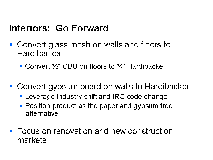 | Interiors: Go Forward Convert glass mesh on walls and floors to Hardibacker Convert 1/2" CBU on floors to 1/4" Hardibacker Convert gypsum board on walls to Hardibacker Leverage industry shift and IRC code change Position product as the paper and gypsum free alternative Focus on renovation and new construction markets |