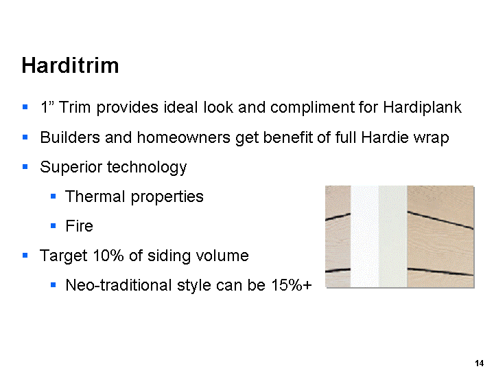 | Harditrim 1" Trim provides ideal look and compliment for Hardiplank Builders and homeowners get benefit of full Hardie wrap Superior technology Thermal properties Fire Target 10% of siding volume Neo-traditional style can be 15%+ |