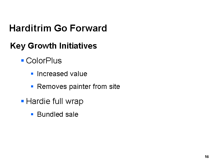 | Harditrim Go Forward Key Growth Initiatives ColorPlus Increased value Removes painter from site Hardie full wrap Bundled sale |