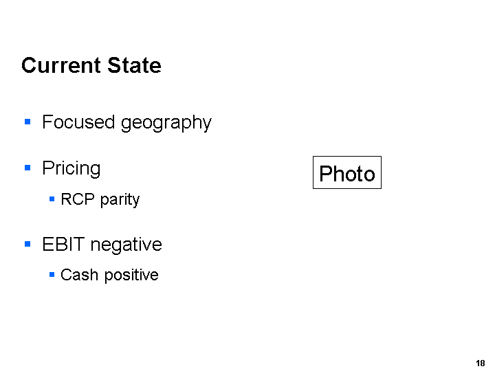 | Current State Focused geography Pricing RCP parity EBIT negative Cash positive Photo |