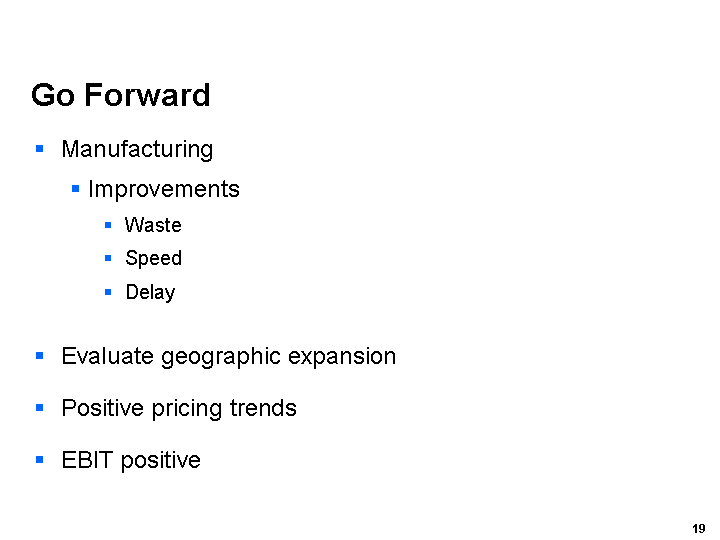 | Go Forward Manufacturing Improvements Waste Speed Delay Evaluate geographic expansion Positive pricing trends EBIT positive |
