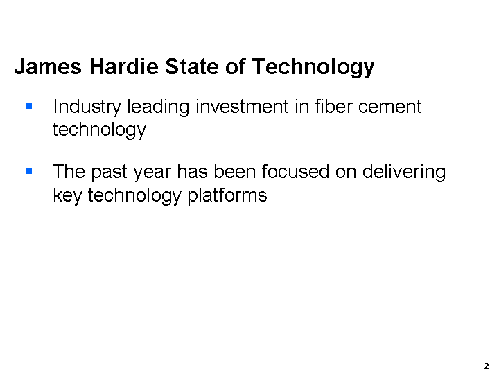 | Industry leading investment in fiber cement technology The past year has been focused on delivering key technology platforms James Hardie State of Technology |