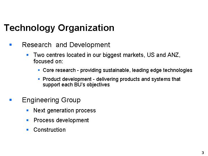 | Research and Development Two centres located in our biggest markets, US and ANZ, focused on: Core research - providing sustainable, leading edge technologies Product development - delivering products and systems that support each BU's objectives Engineering Group Next generation process Process development Construction Technology Organization |