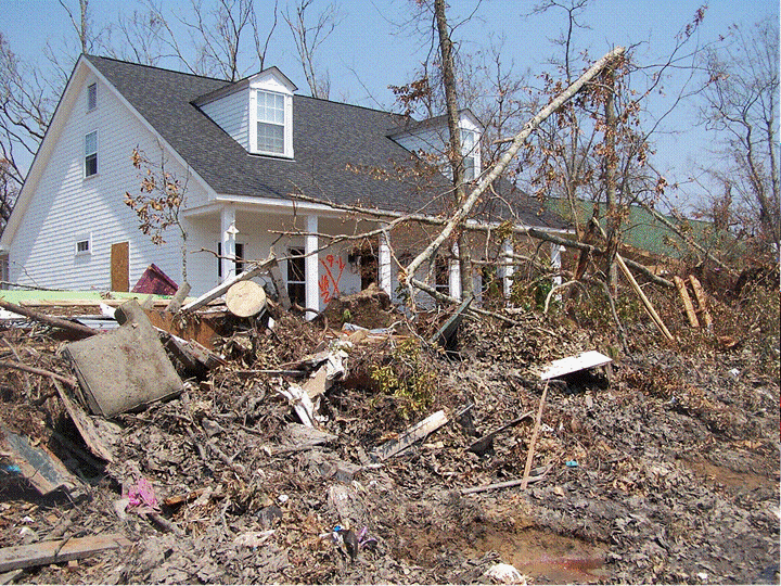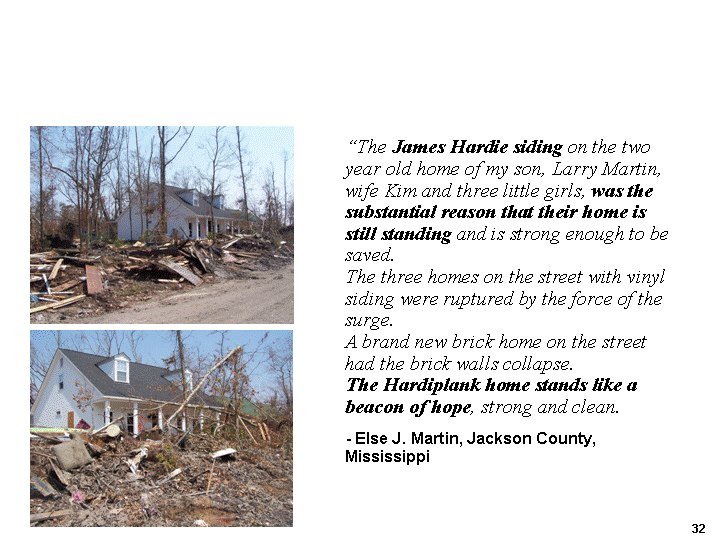 | "The James Hardie siding on the two year old home of my son, Larry Martin, wife Kim and three little girls, was the substantial reason that their home is still standing and is strong enough to be saved. The three homes on the street with vinyl siding were ruptured by the force of the surge. A brand new brick home on the street had the brick walls collapse. The Hardiplank home stands like a beacon of hope, strong and clean. - - Else J. Martin, Jackson County, Mississippi |