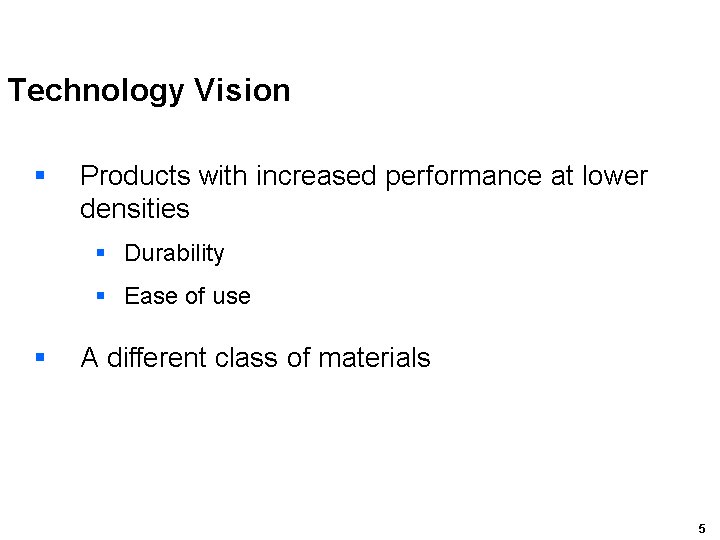 | Products with increased performance at lower densities Durability Ease of use A different class of materials Technology Vision |