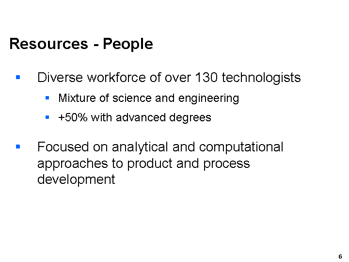 | Diverse workforce of over 130 technologists Mixture of science and engineering +50% with advanced degrees Focused on analytical and computational approaches to product and process development Resources - People |