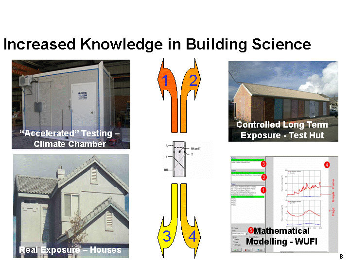 | Increased Knowledge in Building Science 2 1 3 4 Real Exposure - Houses Real Exposure - Houses "Accelerated" Testing - Climate Chamber Mathematical Modelling - WUFI Controlled Long Term Exposure - Test Hut |