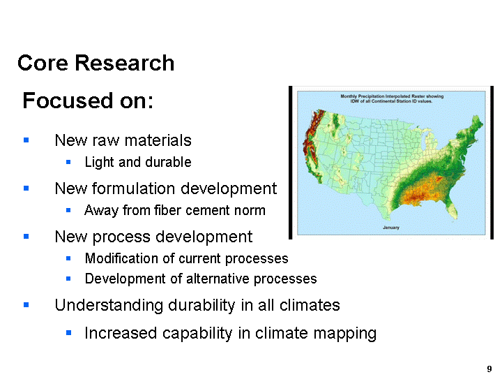 | Focused on: New raw materials Light and durable New formulation development Away from fiber cement norm New process development Modification of current processes Development of alternative processes Understanding durability in all climates Increased capability in climate mapping Core Research |