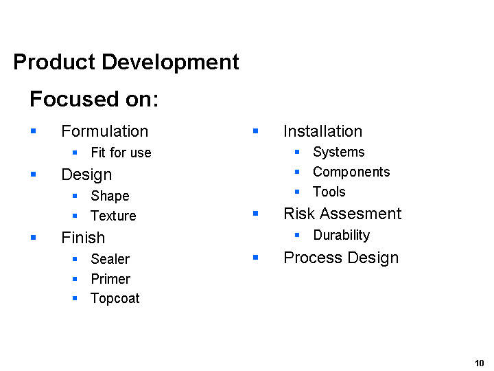 | Formulation Fit for use Design Shape Texture Finish Sealer Primer Topcoat Product Development Installation Systems Components Tools Risk Assesment Durability Process Design Focused on: |