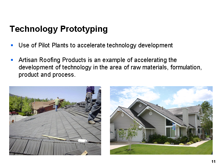 | Technology Prototyping Use of Pilot Plants to accelerate technology development Artisan Roofing Products is an example of accelerating the development of technology in the area of raw materials, formulation, product and process. |