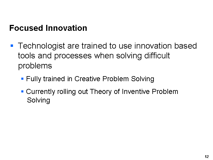 | Focused Innovation Technologist are trained to use innovation based tools and processes when solving difficult problems Fully trained in Creative Problem Solving Currently rolling out Theory of Inventive Problem Solving |