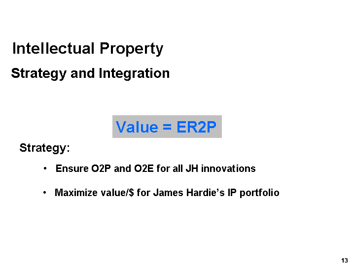 | Strategy and Integration Strategy: Value = ER2P Intellectual Property Ensure O2P and O2E for all JH innovations Maximize value/$ for James Hardie's IP portfolio |
