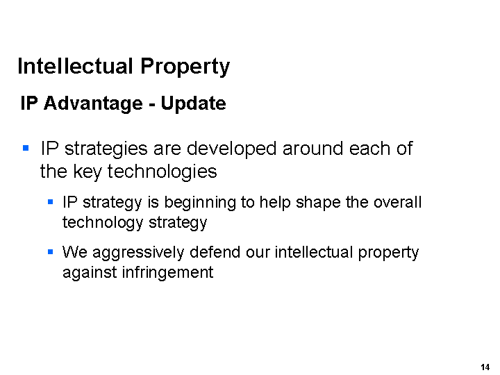 | IP strategies are developed around each of the key technologies IP strategy is beginning to help shape the overall technology strategy We aggressively defend our intellectual property against infringement IP Advantage - Update Intellectual Property |