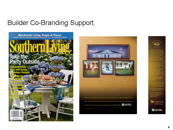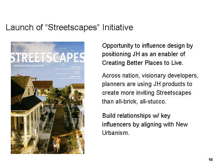 | Opportunity to influence design by positioning JH as an enabler of Creating Better Places to Live. Across nation, visionary developers, planners are using JH products to create more inviting Streetscapes than all-brick, all-stucco. Build relationships w/ key influencers by aligning with New Urbanism. Launch of "Streetscapes" Initiative |